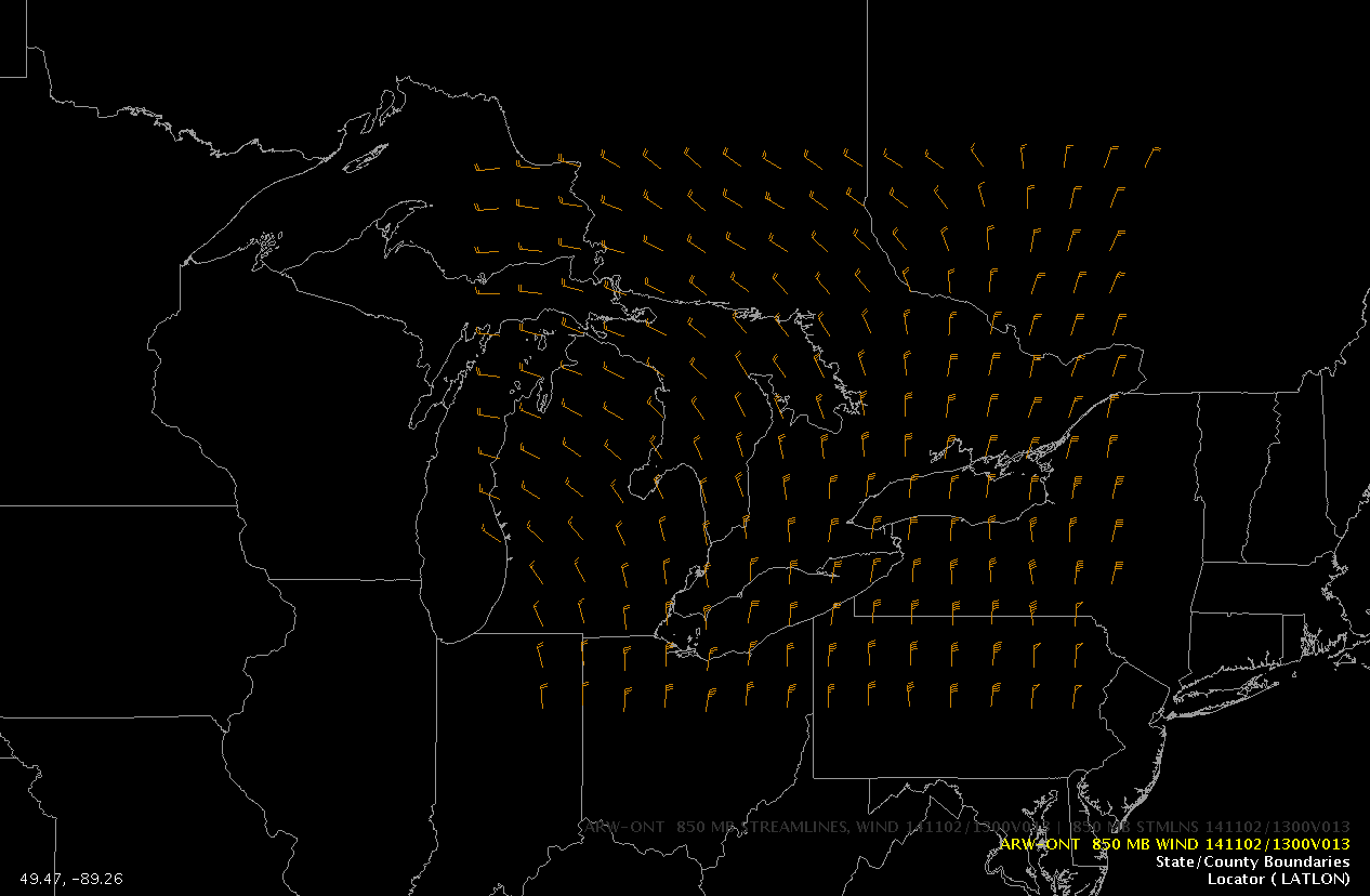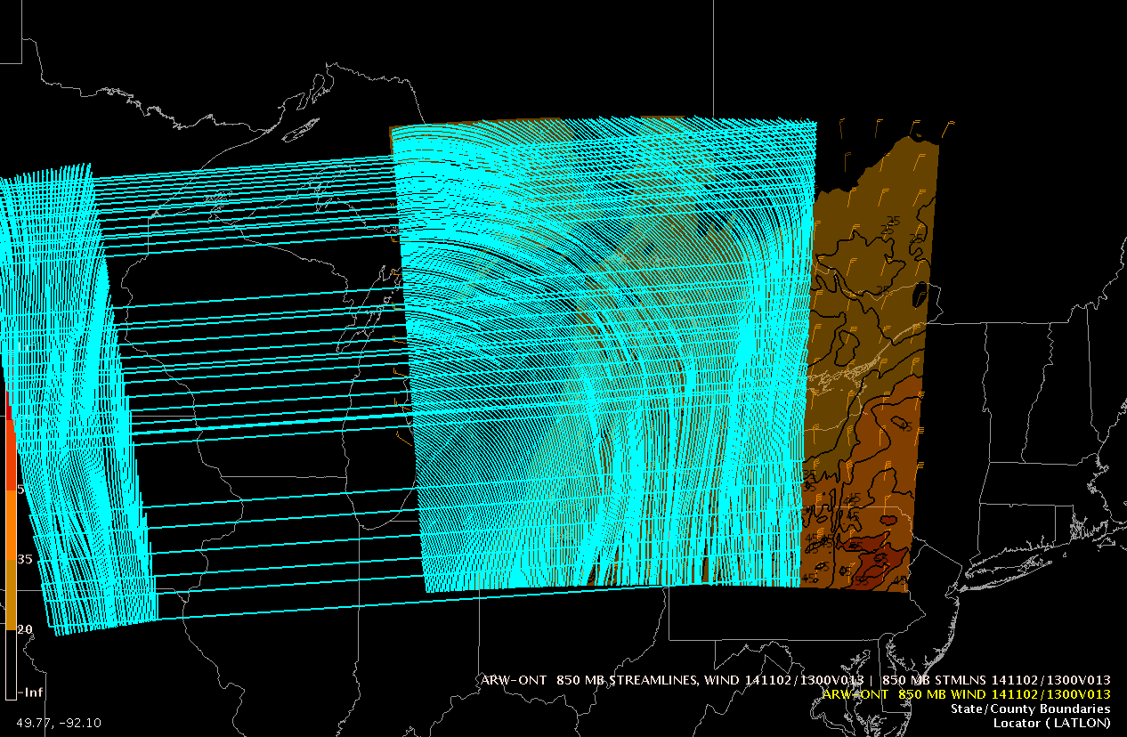 While using the CAVE/NCP perspective I've come across a rather strange problem. When plotting barbs or isotachs the plot is normal. However, when I plot streamlines the contours are shifted to the west and stretched into Minnesota and Iowa, when my WRF-ARW domain ends at the eastern shore of Lake Erie. Enclosed are two screen captures to illustrate the problem. Brian Bernard