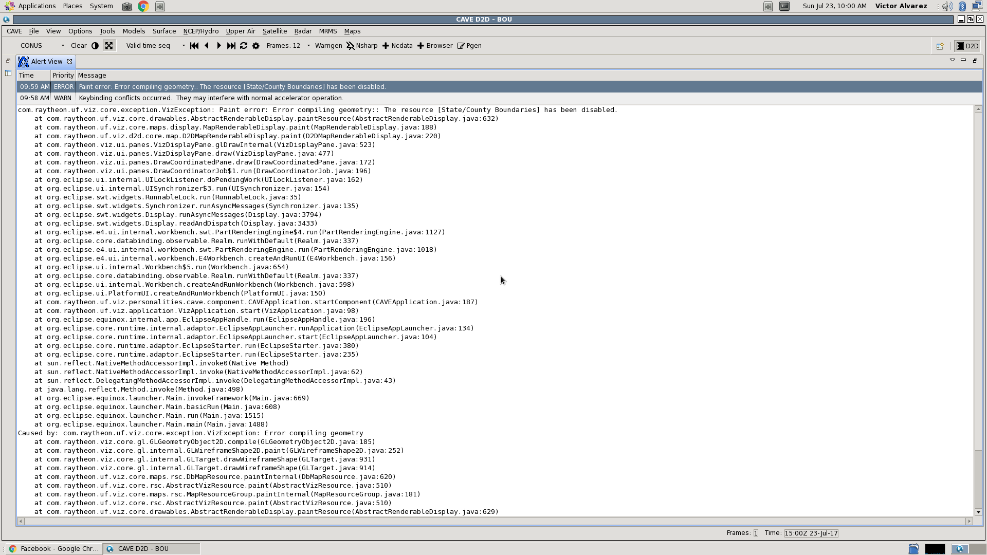 Hello, Upon firing up AWIPS, I receive a keybinding conflict error & "Paint error: Error compiling geometry:: The recourse [State/County Boundaries] has been disabled." I receive this similar error when loading up pretty much everything else. I noticed Brian had a similar issue but fixed it by deleting the caveData directory. However, he followed up days later with the same complaint. Anyhow, this did not fix my issue, and neither did a fresh install, yum update, change of server, you name it. Any help would be greatly appreciated, thanks! Below I will attach a few files.