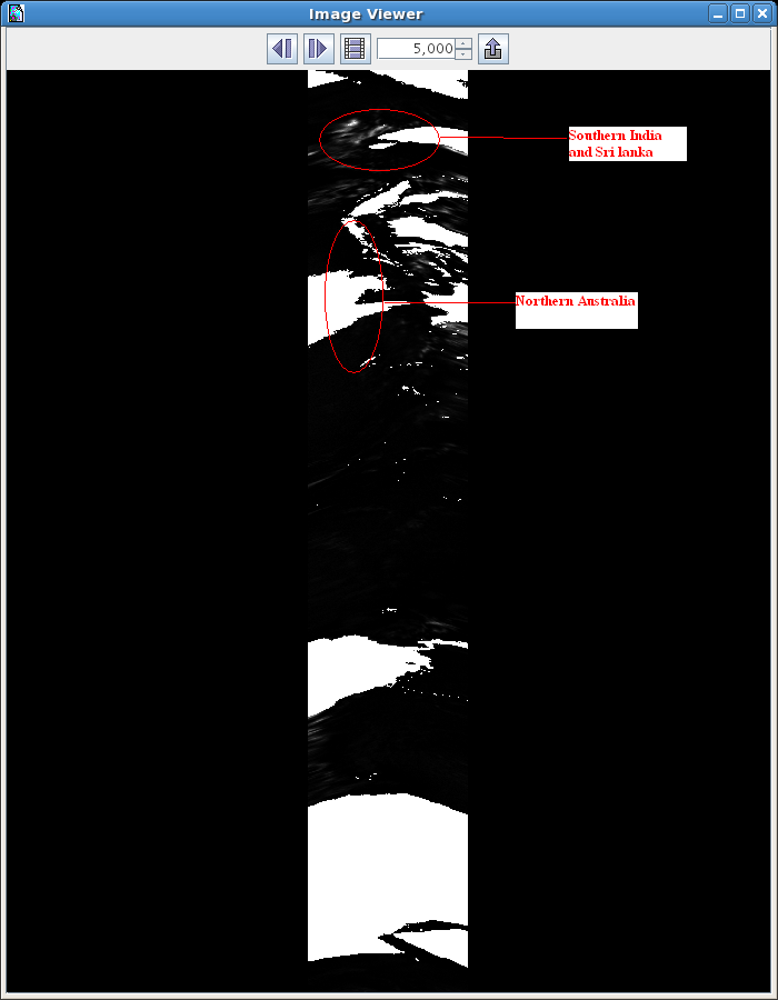 Here is the attached snapshot of one of the parameter. On Wed, Aug 22, 2012 at 7:22 PM, ghansham sangar <ghanshamsangar@xxxxxxxxx>wrote: > Hello Sir.. > Hope you are doing fine. > > I understand you point of frame of reference. Even I was also confused > when > I saw that dataset for the first time. But later I realized in one of the > conversation with > Tom Rink Sir, also, this is what came out (as told in earlier mail too): > The orbit has an inclination of as low as 20 deg (no coverage on poles). > The reason is to improve the temporal resolution over the tropics. > And the sensor scans across track w.r.t to such low inclination track. > And that is why the data is packed also in that manner (up down). > The best thing I can do is post one snapshot generated from toolsUI of > one > of the parameter displayed as image to have a better understanding of what > exactly > the data looks like. I know its a pretty tough scanning geometry to > understand. > > regards > Ghansham > > > On Wed, Aug 22, 2012 at 2:35 AM, Tom Whittaker <whittaker@xxxxxxxx> wrote: > >> Hello Ghansham... >> >> I hope you are well. >> >> I believe the "scan direction" (either "up/down" or "left/right") is a >> matter of perspective -- if the frame of reference is on the >> satellite, looking "forward" along the flight path, then I would be >> more inclined to say "left/right", as "up/down" would refer to some >> vertical scanning -- from my frame of reference on the satellite. >> >> Regarding CF Conventions. There are no conventions for dealing with >> this. There have been discussions in the past dealing with "swath >> data", and you might have a Google of that (plus 'netcdf') and see >> what others have been thinking about. >> >> There is also at least one reference to some data already being >> written to hdf files, which might prove of interest. The sad fact is >> that the satellite community for the longest time did not embrace >> NetCDF, and so we must play "catch-up" with the people who have >> defined conventions for model/gridded data and in-situ data. >> >> My take is that some common characteristics (like 'band' and >> 'central_wavelength' (or _wavenumber) should be defined using >> conventions and "standard_names", but that characteristics of >> particular platforms must, by necessity, be defined for those >> platforms. I also think that the use of the "standard_names" will go >> a long way toward helping application developers in writing file >> readers that can understand some of the basic structures of the data, >> while at the same time providing end users an opportunity to write >> specialized interfaces that meet their particular research or >> operational needs. >> >> Best wishes, >> >> tom >> >> >> -- >> Tom Whittaker >> University of Wisconsin-Madison >> Space Science & Engineering Center (SSEC) >> Cooperative Institute for Meteorological Satellite Studies (CIMSS) >> 1225 W. Dayton Street >> Madison, WI 53706 USA >> ph: +1 608 262 2759 >> > >