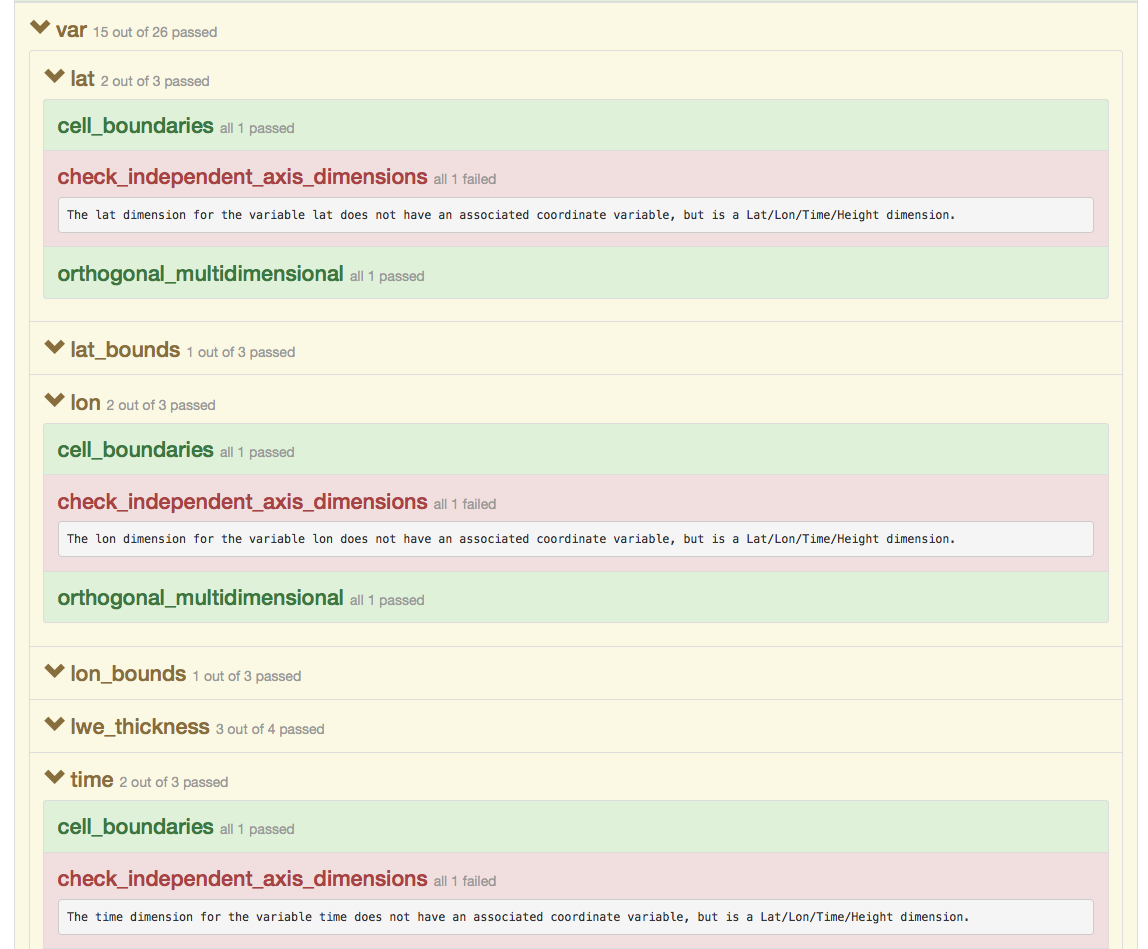 To whomever can help, I have a 3D (time, lat, lon) geo-gridded data file that has failed a CF metadata compliance check with the following error: "The lat dimension for the variable lat does not have an associated coordinate variable, but is a Lat/Lon/Time/Height dimension." I get this error for the time, lat, and lon variables. Attached is a screenshot of the error as provided by the PO.DAAC Metadata Compliance Checker tool, which is openly accessible here: http://podaac-uat.jpl.nasa.gov/mcc/ Also attached is a netCDF header dump of the data file in question. It seems as though the time, lat, and lon variables are not properly declared as coordinate variables, or their dimensions are somehow not recognized as such. Whatever the case may be, the CF literature doesn’t seem to shed any light in to why this might be the case. Also, in my own close examination of the variable metadata, nothing seems to be amiss with respect to these variables being declared properly as coordinate variables. Am I missing something? If anyone can shed more light on this, I would be most appreciative. Respectfully, David ================================================== David Moroni Ocean Wind and Scatterometry Data Engineer Physical Oceanography Distributed Active Archive Center Jet Propulsion Laboratory 4800 Oak Grove Dr M/S 158-242 La Canada Flintridge, CA 91011 Phone: 818.354.2038 Fax: 818.393.1190 ==================================================