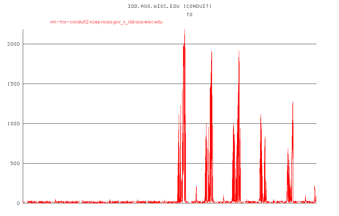 Hi Pete, et al.:We here at UAlbany continue to get spotty reception of the GFS since 00Z today … anyone else having issues? We feed from Madison and State College.Earlier thread below: -------------------------Yeah, I’m not surprised that the addition of the ¼ deg GFS is causing the need for a bigger queue (and likely burlier machine). That’s the main reason I have resisted requesting it.I’ll fix the issue that makes ldmstats show “install.atmos…” instead of “cascade.atmos…”Something else must be at play since the ¼ GFS has been flowing for several weeks now without incident, likely tied to the increased latency you starting seeing.Looks like we only got the GFS through 60 hours today with the 12Z run, so something definitely appears to be amiss … I’ll cc: the conduit list to see if anyone else is noticing problems._____________________________________________ Kevin Tyle, Systems Administrator Dept. of Atmospheric & Environmental Sciences University at Albany Earth Science 235, 1400 Washington Avenue Albany, NY 12222 Email: ktyle@xxxxxxxxxx <mailto:ktyle@xxxxxxxxxx> Phone: 518-442-4578 _____________________________________________ *From:*Pete Pokrandt [mailto:poker@xxxxxxxxxxxx] *Sent:* Tuesday, September 08, 2015 12:17 PM *To:* Tyle, Kevin R <ktyle@xxxxxxxxxx> *Cc:* Daes Support <daessupport@xxxxxxxxxx> *Subject:* Re: How's your GFS?My GFS appears to be complete, but I do see that something's going on with our feed - the latencies jumped way up somewhere over the weekend:http://rtstats.unidata.ucar.edu/cgi-bin/rtstats/iddstats_nc?CONDUIT+idd.aos.wisc.eduYou're seeing the same, and increased yet from your feed from Penn State (at least to the machine 'install.atmos.albany.edu - I don't see any stats reported from cascade, which is what it looks like you are feeding from me on)http://rtstats.unidata.ucar.edu/cgi-bin/rtstats/iddstats_nc?CONDUIT+install.atmos.albany.eduI think I need to buy more memory and keep a larger queue on idd.aos.wisc.edu with the 0.25 deg GFS coming in. There are times where my queue only holds about 20 minutes of data, which is likely contributing to your incomplete GFS files..Here's what my 0.5 deg (the gblav2.* files) and the 0.25 deg (gblav0p25 out to 87 h) look like for the 00 ant 06 UTC runs today0.5 deg:-rw-r--r--. 1 ldm ldm 60953687 Sep 7 22:25 /data/grib2/gblav2.15090800_F000 -rw-r--r--. 1 ldm ldm 66996066 Sep 7 22:28 /data/grib2/gblav2.15090800_F003 -rw-r--r--. 1 ldm ldm 67902041 Sep 7 22:30 /data/grib2/gblav2.15090800_F006 -rw-r--r--. 1 ldm ldm 67961293 Sep 7 22:32 /data/grib2/gblav2.15090800_F009 -rw-r--r--. 1 ldm ldm 68081826 Sep 7 22:35 /data/grib2/gblav2.15090800_F012 -rw-r--r--. 1 ldm ldm 68710398 Sep 7 22:35 /data/grib2/gblav2.15090800_F015 -rw-r--r--. 1 ldm ldm 69664268 Sep 7 22:36 /data/grib2/gblav2.15090800_F018 -rw-r--r--. 1 ldm ldm 69177180 Sep 7 22:38 /data/grib2/gblav2.15090800_F021 -rw-r--r--. 1 ldm ldm 69816235 Sep 7 22:38 /data/grib2/gblav2.15090800_F024 -rw-r--r--. 1 ldm ldm 69010253 Sep 7 22:39 /data/grib2/gblav2.15090800_F027 -rw-r--r--. 1 ldm ldm 69786985 Sep 7 22:40 /data/grib2/gblav2.15090800_F030 -rw-r--r--. 1 ldm ldm 68876266 Sep 7 22:41 /data/grib2/gblav2.15090800_F033 -rw-r--r--. 1 ldm ldm 69376601 Sep 7 22:42 /data/grib2/gblav2.15090800_F036 -rw-r--r--. 1 ldm ldm 69029846 Sep 7 22:43 /data/grib2/gblav2.15090800_F039 -rw-r--r--. 1 ldm ldm 69142392 Sep 7 22:44 /data/grib2/gblav2.15090800_F042 -rw-r--r--. 1 ldm ldm 68990399 Sep 7 22:45 /data/grib2/gblav2.15090800_F045 -rw-r--r--. 1 ldm ldm 69343366 Sep 7 22:46 /data/grib2/gblav2.15090800_F048 -rw-r--r--. 1 ldm ldm 69150894 Sep 7 22:47 /data/grib2/gblav2.15090800_F051 -rw-r--r--. 1 ldm ldm 69504675 Sep 7 22:47 /data/grib2/gblav2.15090800_F054 -rw-r--r--. 1 ldm ldm 69196832 Sep 7 22:48 /data/grib2/gblav2.15090800_F057 -rw-r--r--. 1 ldm ldm 69335487 Sep 7 22:50 /data/grib2/gblav2.15090800_F060 -rw-r--r--. 1 ldm ldm 69261676 Sep 7 22:50 /data/grib2/gblav2.15090800_F063 -rw-r--r--. 1 ldm ldm 69166068 Sep 7 22:51 /data/grib2/gblav2.15090800_F066 -rw-r--r--. 1 ldm ldm 69054105 Sep 7 22:53 /data/grib2/gblav2.15090800_F069 -rw-r--r--. 1 ldm ldm 68895264 Sep 7 22:54 /data/grib2/gblav2.15090800_F072 -rw-r--r--. 1 ldm ldm 69202038 Sep 7 22:56 /data/grib2/gblav2.15090800_F075 -rw-r--r--. 1 ldm ldm 69339334 Sep 7 22:56 /data/grib2/gblav2.15090800_F078 -rw-r--r--. 1 ldm ldm 69181930 Sep 7 22:57 /data/grib2/gblav2.15090800_F081 -rw-r--r--. 1 ldm ldm 69674148 Sep 7 22:58 /data/grib2/gblav2.15090800_F084 -rw-r--r--. 1 ldm ldm 69383769 Sep 7 22:58 /data/grib2/gblav2.15090800_F087 -rw-r--r--. 1 ldm ldm 69645526 Sep 7 22:59 /data/grib2/gblav2.15090800_F090 -rw-r--r--. 1 ldm ldm 69119323 Sep 7 23:00 /data/grib2/gblav2.15090800_F093 -rw-r--r--. 1 ldm ldm 69363296 Sep 7 23:01 /data/grib2/gblav2.15090800_F096 -rw-r--r--. 1 ldm ldm 69030287 Sep 7 23:03 /data/grib2/gblav2.15090800_F099 -rw-r--r--. 1 ldm ldm 69819322 Sep 7 23:03 /data/grib2/gblav2.15090800_F102 -rw-r--r--. 1 ldm ldm 69498561 Sep 7 23:04 /data/grib2/gblav2.15090800_F105 -rw-r--r--. 1 ldm ldm 69690447 Sep 7 23:05 /data/grib2/gblav2.15090800_F108 -rw-r--r--. 1 ldm ldm 69274213 Sep 7 23:06 /data/grib2/gblav2.15090800_F111 -rw-r--r--. 1 ldm ldm 70089206 Sep 7 23:07 /data/grib2/gblav2.15090800_F114 -rw-r--r--. 1 ldm ldm 70007688 Sep 7 23:08 /data/grib2/gblav2.15090800_F117 -rw-r--r--. 1 ldm ldm 70237308 Sep 7 23:08 /data/grib2/gblav2.15090800_F120 -rw-r--r--. 1 ldm ldm 69849708 Sep 7 23:09 /data/grib2/gblav2.15090800_F123 -rw-r--r--. 1 ldm ldm 69883550 Sep 7 23:11 /data/grib2/gblav2.15090800_F126 -rw-r--r--. 1 ldm ldm 69586365 Sep 7 23:11 /data/grib2/gblav2.15090800_F129 -rw-r--r--. 1 ldm ldm 70110782 Sep 7 23:12 /data/grib2/gblav2.15090800_F132 -rw-r--r--. 1 ldm ldm 69430545 Sep 7 23:13 /data/grib2/gblav2.15090800_F135 -rw-r--r--. 1 ldm ldm 69461630 Sep 7 23:14 /data/grib2/gblav2.15090800_F138 -rw-r--r--. 1 ldm ldm 69264487 Sep 7 23:15 /data/grib2/gblav2.15090800_F141 -rw-r--r--. 1 ldm ldm 69553206 Sep 7 23:16 /data/grib2
