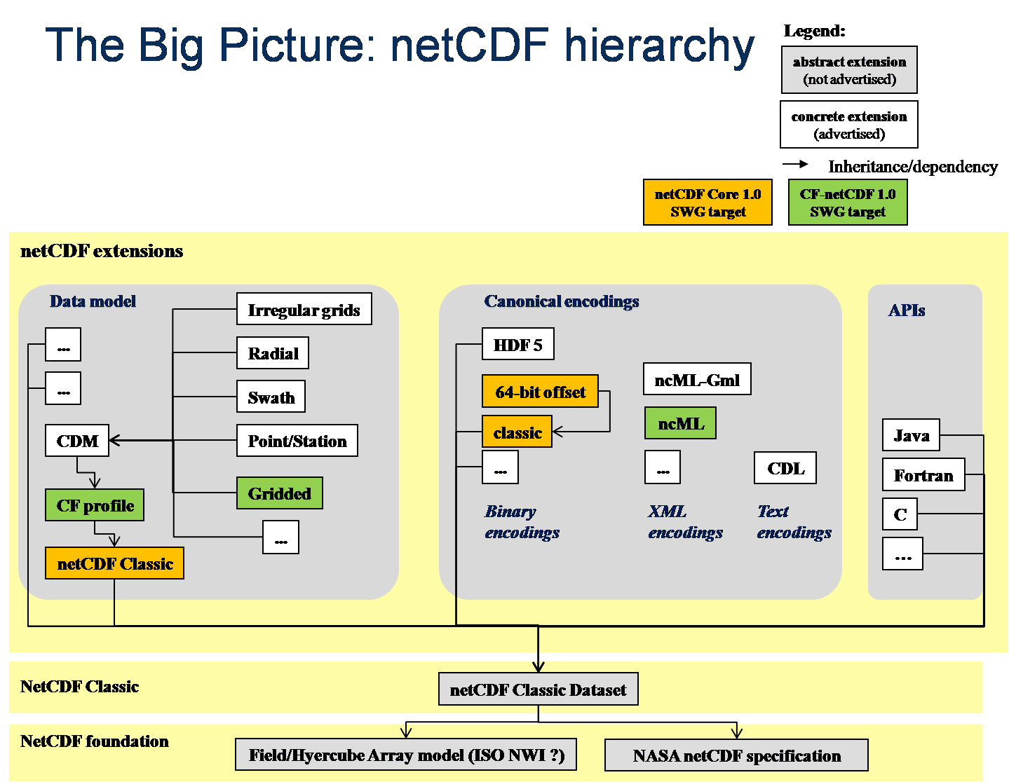 Hello to all you CF-netCDFers: Via Rich Signell, Roy Mendelssohn recommended an article that espouses an interesting philosopy, namely "Don't solve problems, copy success:" http://www.fastcompany.com/magazine/142/switch-how-to-change-things-when-change-is-hard.html I am taking that suggestion to heart so my proposed new approach to establishing an OGC CF-netCDF standard is modeled on the highly praised and apparently successful WCS 2.0 specifications drafted by Peter Baumann and on Stefano Nativi's very useful clarifications regarding standardization targets in his presentation to the CF-netCDF SWG at the recent OGC TC meeting. To that end, I have drafted a Best Practice Document that provides an overview of the general CF-netCDF landscape. It includes a list of possible standardization targets and shows how they fit together in the long term as a core standard, extensions to the core, and application profiles that employ the core and some extensions. A copy of the draft Best Practice Overview is attached. After mulling over the draft and having a few brief discussions, I'm suggesting that the core be confined to a specification of the netCDF Classic Data Model. With that very limited core, it makes possible extensions that include - the Enhanced NetCDF Data Model, - CF (and possibly other) conventions which can also be considered extensions to the core data model - several binary, xml, and text encoding options - APIs I submit that this Really Big Picture for netCDF standardization will be very useful for discussion even if we end up taking a different avenue to OGC standardization. To provide a sense of what it would look like, I've also drafted a netCDF core specification confined solely to the netCDF classic data model. This is a good illustration of the approach taken in WCS which results in a number of concise and to-the-point standards documents tied together with a Best Practice Overview. Finally I've attached a diagram created by Stefano Nativi that provides an alternative to my diagram in the Best Practice draft. These are all obviously very rough drafts and the new approach requires substantial discussion so I'm sending them out now to get the discussion and adaptation started sooner rather than later. In the meantime, I'll be working on a draft specification for the netCDF classic binary encoding that should fit into the context of the new approach/structure. If I can get that done in time, perhaps we can discuss all this at a CF-netCDF SWG telecon next Thursday. Happy Easter. -- Ben PS By proposing this on this date, I have a convenient out in case I have completely missed the mark yet again. (smile face here)