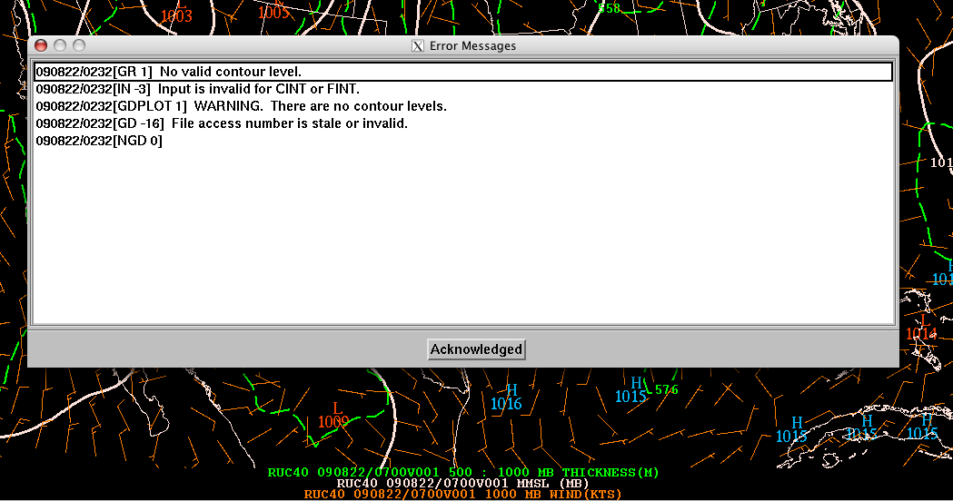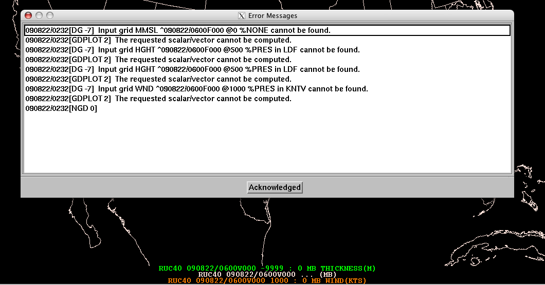 I still can't get NMAP to properly display model grids, but I can display the same restore files using gdplot2 and an XW. For example, tonight I downloaded the ruc2 data, 00-12 hours. I load a restore file in NMAP. The first frame is blank (hours 00), then it displays 01-11 properly, and 12 is blank. For the frames that are blank, it just shows the title on the screen, no grids plotted. The Error in NMAP says: <see attached error1.png> For the frames that actually load, they ALSO have an error message: <see attached error2.png> Again, even for the hours that do not load, I can manually run gdplot2 and they display fine. So, the grid files are fine, and the restore files are fine. Does NMAP not use gdplot2? What could possibly be wrong? Ryan
