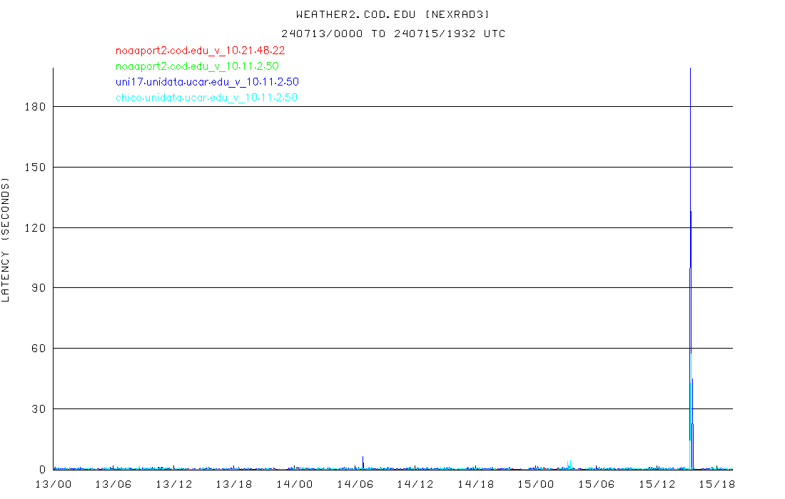 I would agree. Here at the College of DuPage, our level 3 feed has been absolutely spot on. Hopefully the attached JPG will get through, but if you don’t desire to click on it, I understand; it shows less than 1 second delays, except when I rebooted the server for a kernel security update this morning, which took about 3 minutes. Gilbert Gilbert Sebenste Meteorology Support Analyst [cid:image001.png@01DAD6C3.AFCDAE30] From: ldm-users <ldm-users-bounces@xxxxxxxxxxxxxxxx> On Behalf Of Ryan Hickman via ldm-users Sent: Monday, July 15, 2024 11:49 AM To: Michael Barfield <mbarfield@xxxxxxxxxxxxxxxx> Cc: ldm-users@xxxxxxxxxxxxxxxx; Network Team <network@xxxxxxxxxxxxxxxx> Subject: [External] Re: [ldm-users] Systematic Outages with Level 3 Feed CAUTION: This email originated from outside of COD’s system. Do not click links, open attachments, or respond with sensitive information unless you recognize the sender and know the content is safe. There haven't been any major issues with the NOAAPORT feed for NEXRAD Level 3. The regularity of your issues certainly suggests network congestion. 8 PM EST is conveniently 00 UTC. On Mon, Jul 15, 2024 at 10:14 AM Michael Barfield <mbarfield@xxxxxxxxxxxxxxxx<mailto:mbarfield@xxxxxxxxxxxxxxxx>> wrote: Good morning, I am emailing to inquire about some recent, systematic outages we have seen with our level 3 ingestion. For the past week we have been seeing our feed drop on both servers, around 8PM EST, and then eventually restore after nearly 3 hours. We see no other impact to regular network traffic that can be correlated with this issue. Is anyone else experiencing this? We have migrated one server to the latest LDM release on an entirely new VM using the Unidata Docker image and that machine is still experiencing the same regular outage. We are continuing to investigate if this is possibly an upstream network path/saturation issue but wanted to see if anyone else has seen similar behavior as of late. Any help or insight is appreciated. [cid:image002.png@01DAD6C3.AFCDAE30] Thank you, Michael Barfield Network Engineer ERC Broadband [cid:image003.png@01DAD6C3.AFCDAE30] https://ercbroadband.com<https://ercbroadband.com/> E-Mail - mbarfield@xxxxxxxxxxxxxxxx<mailto:mbarfield@xxxxxxxxxxxxxxxx> Work Phone – (828) 350-2414 24hrs - (866) 372-7110 _______________________________________________ NOTE: All exchanges posted to Unidata maintained email lists are recorded in the Unidata inquiry tracking system and made publicly available through the web. Users who post to any of the lists we maintain are reminded to remove any personal information that they do not want to be made public. ldm-users mailing list ldm-users@xxxxxxxxxxxxxxxx<mailto:ldm-users@xxxxxxxxxxxxxxxx> For list information or to unsubscribe, visit: https://www.unidata.ucar.edu/mailing_lists/