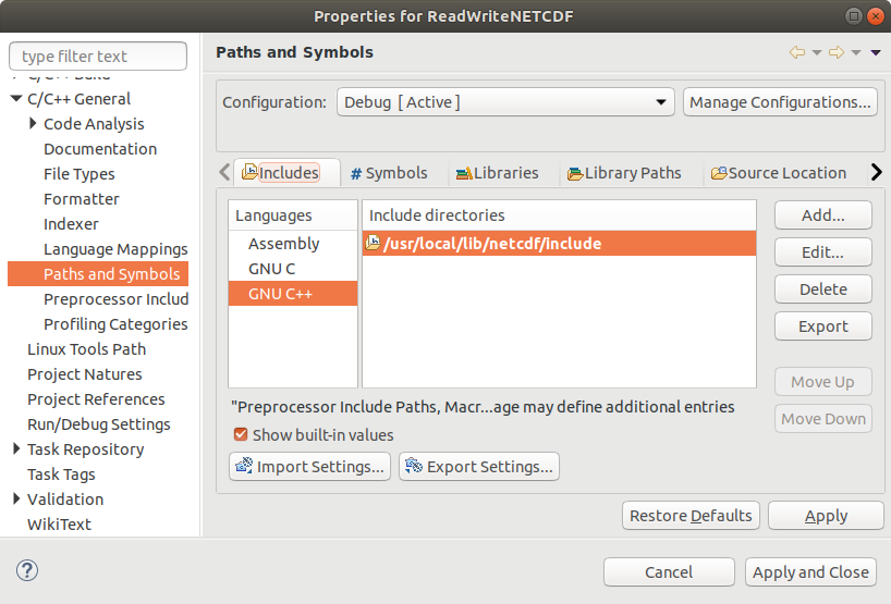I found the errors as bellow:g++ -I/usr/local/lib/netcdf/include -O0 -g3 -Wall -c -fmessage-length=0 -MMD -MP -MF"src/ReadWriteNETCDF.d" -MT"src/ReadWriteNETCDF.o" -o "src/ReadWriteNETCDF.o" "../src/ReadWriteNETCDF.cpp"