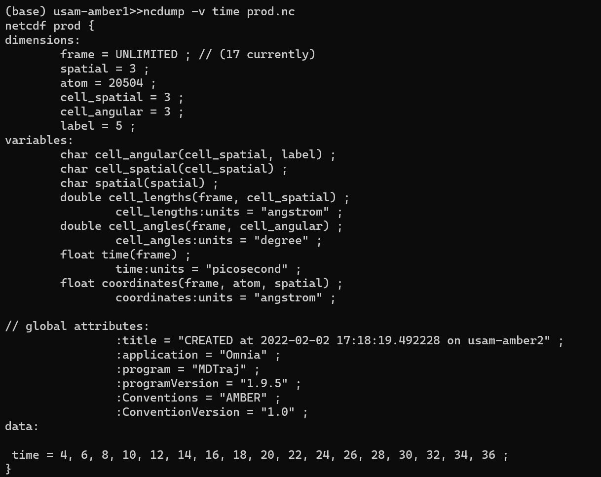 >> attributes:                :Conventions = "AMBER" ;