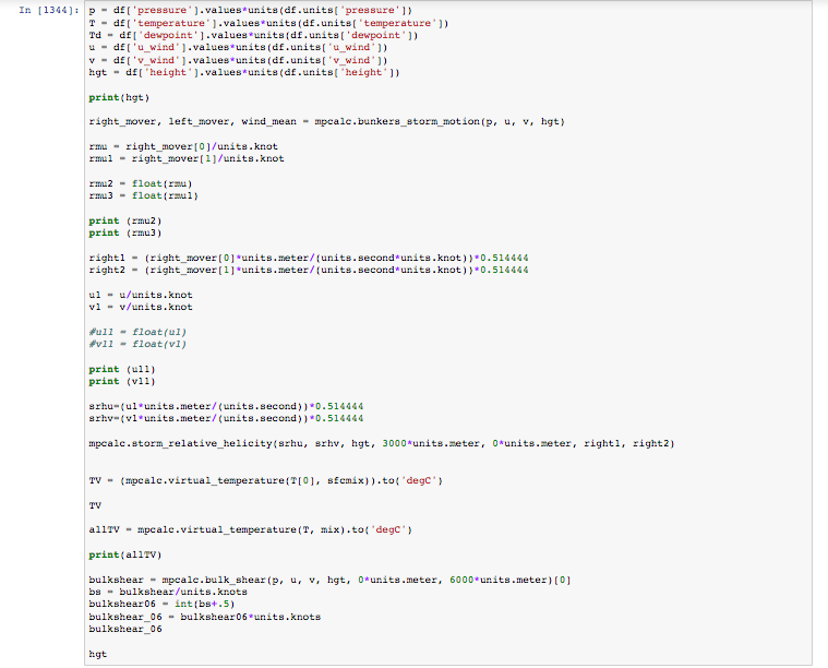 Hi, I am working on creating custom soundings using the Metpy programs. I am running into some issues, though (discovered today). The main one being that the height is initially read into the code correctly, but several blocks of Jupyter code later and the height reverts back to 0 m as the surface height. To combat this, I reread in the height in the block that I was working with, and printed the height at the beginning and end of the block of code. The height was read in correctly at the beginning of the block, but incorrectly at the end of the code. I have attached two images. One is of the block of code, and the other is of the output. This is throwing off some of my wind shear calculations, as well as my ability to plot the LCL in meters accurately (I have it in hPa currently, which isn't as effective at conveying the information). This issue isn't as big a deal in the eastern US, but on the high plains, it makes a big difference (example: my LCL was at 1670 m where it should be around 880m)! If you could be of any help, that would be awesome! Sincerely, Pierce Larkin
