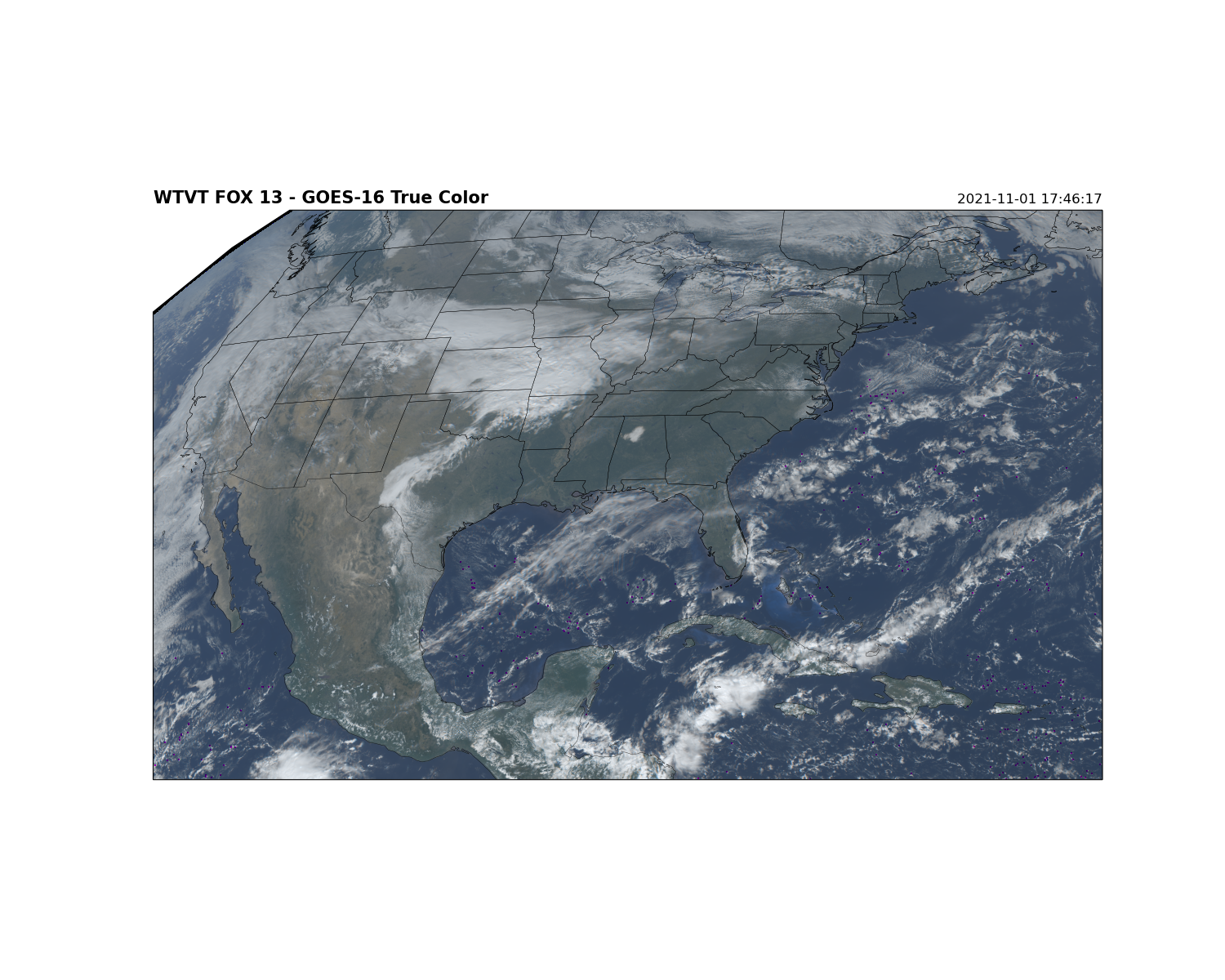 Hello, I have been working with Tom Yoksas to get all the goes-restitch setup. I have been trying to make the "True Color" images such as the image attached to this email called conus1.png The issue I am running into is that there are small purple specs in the imagery. After looking through the bands I noticed it appears the issue is in the "green" or channel 3 band. I am also attaching the channel 3 imagery where you can clearly see the white speckles in the imagery. I am getting my data via a Novra receiver that working with Tom has very low error rates, so I feel confident it is not something I am inducing into the imagery. I am also only finding it in the Channel 3 imagery. Is this something that the goes-restitch.py script could be causing or do you know what might be causing this issue? Thanks so much for any help you can provide me! Jim Weber jim.weber@xxxxxxx<mailto:jim.weber@xxxxxxxxx> Certified Broadcast Meteorologist FOX 13 News WTVT - TV 3213 West Kennedy Blvd. Tampa, Florida 33609 Phone 813-870-9657 [fox13newscom] This message and its attachments may contain legally privileged or confidential information. It is intended solely for the named addressee(s). If you are not an addressee indicated in this message (or responsible for delivery of the message to an addressee), you may not copy or deliver this message or its attachments to anyone. Rather, you should permanently delete this message and its attachments and kindly notify the sender by reply e-mail. Any content of this message and its attachments that does not relate to the official business of Fox Corporation, or its subsidiaries must be taken not to have been sent or endorsed by any of them. No representation is made that this email or its attachments are without defect.
