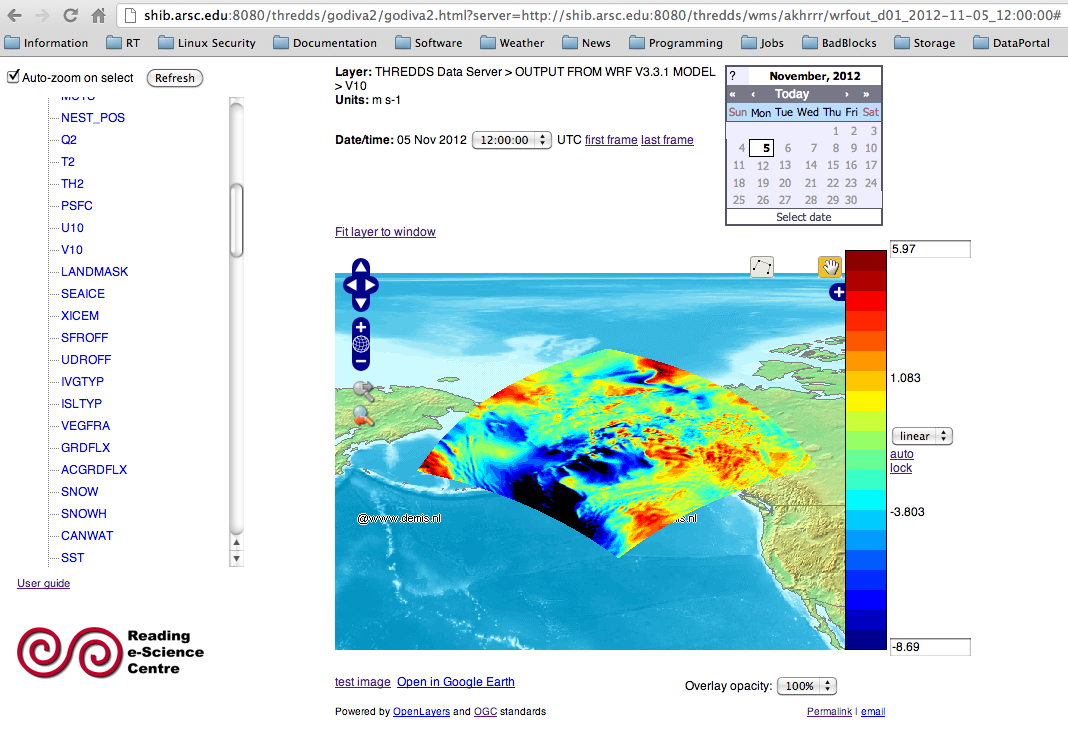 Hi! I was testing out the latest TDS snapshot. I've run across some problems that I'd like to report. - Server: [image: THREDDS Data Server] THREDDS Data Server - Webapp Name: THREDDS Data Server - Webapp Version: 4.3.14-SNAPSHOT - Webapp Version Build Date: 20121020.1514 - Abstract: Scientific Data Dataset: grab one of WRF (wrfout) from here: http://weather.arsc.edu/Operational/HRRR-AK/Products/wrfout/2012110512/wrfout_d01_2012-11-05_12:00:00 Summary: Godiva2 shows the fields just fine, but clicking on "test image" or "Open in Google Earth" produces a cropped image. Adjusting the long variable I can obtain the full field. "Fit layer to window" does not center over the dataset. Moving the view does show the entire layer properly. It looks like the server is open to the Internet so the links should work. I will attach some snapshots just in case. Images/URLs: http://shib.arsc.edu:8080/thredds/godiva2/godiva2.html?server=http://shib.arsc.edu:8080/thredds/wms/akhrrr/wrfout_d01_2012-11-05_12:00:00# Clicking on test image gives: http://shib.arsc.edu:8080/thredds/wms/akhrrr/wrfout_d01_2012-11-05_12:00:00?LAYERS=V10&ELEVATION=0&TIME=2012-11-05T12%3A00%3A00.000Z&TRANSPARENT=true&STYLES=boxfill%2Frainbow&CRS=EPSG%3A4326&COLORSCALERANGE=-8.69%2C5.97&NUMCOLORBANDS=20&LOGSCALE=false&SERVICE=WMS&VERSION=1.1.1&REQUEST=GetMap&EXCEPTIONS=application%2Fvnd.ogc.se_inimage&FORMAT=image%2Fpng&SRS=EPSG%3A4326&BBOX=-149.47059022349,39.821965700053,-114.54157269436,76.714340992019&WIDTH=256&HEIGHT=256 If I adjust the BBOX to say -190.0, I can get the full field. http://shib.arsc.edu:8080/thredds/wms/akhrrr/wrfout_d01_2012-11-05_12:00:00?LAYERS=V10&ELEVATION=0&TIME=2012-11-05T12%3A00%3A00.000Z&TRANSPARENT=true&STYLES=boxfill%2Frainbow&CRS=EPSG%3A4326&COLORSCALERANGE=-8.69%2C5.97&NUMCOLORBANDS=20&LOGSCALE=false&SERVICE=WMS&VERSION=1.1.1&REQUEST=GetMap&EXCEPTIONS=application%2Fvnd.ogc.se_inimage&FORMAT=image%2Fpng&SRS=EPSG%3A4326&BBOX=-190,39.821965700053,-114.54157269436,76.714340992019&WIDTH=256&HEIGHT=256 I believe this seems like a computational error for datasets that drape over 180 degree line. The image for google earth is also cropped (attached). Is there metadata info we can add to the NetCDF file to the catalog make it better behaved? Thanks! Rob -- Rob Cermak (cermak@xxxxxxxxxx) Arctic Region Supercomputing Center(UAF) consult@xxxxxxxx Life Sciences Informatics(IAB/UAF) Support biotech@xxxxxxxxxx 907-450-8638 (WRRB 105/Cube 109;WRRB 222)