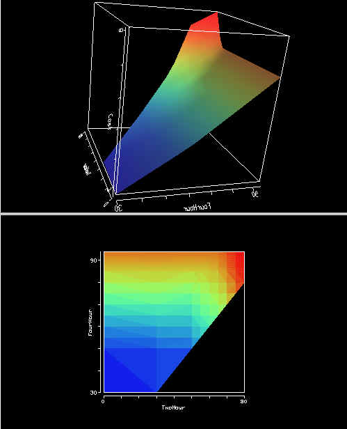 I hope I'm just not missing something stupid... I did look in the archives but didn't find the answer to this question. I have an Irregular2DSet and an Irregular3DSet. They have the same x and y values, but in the 3D case I also have z to represent height. The triangles connecting the vertices are the same in each case. I map another value to rgb color. In the case of the 3D display, the colors are smoothly interpolated (which is what I want) *whether or not* I do a "setTextureEnable(false)". In the case of the 2D display, the colors are "pixelated" (each triangle has a constant color), again, whether or not I do a "setTextureEnable(false)". Can anyone help me get the 2D display to look as smooth as the 3D display does? Here's a picture if that helps: (See attached file: surfaces.jpg) Thanks Donna Donna L. Gresh, Ph.D. IBM T.J. Watson Research Center (914) 945-2472 http://www.research.ibm.com/people/g/donnagresh gresh@xxxxxxxxxx