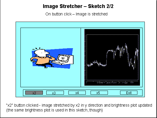 Hi Curtis, Yippee, someone gets what I'm trying to do! Student labs are closed over the weekend, will try out what you said on Monday morning. >I'm not certain whether your goal is to have four displays (an "original", >an "x2", an "x3" and an "x4"), or just one or two displays that get updated >when the buttons are pressed. I'm after the latter; find attached a screen shot of a sketch of the program. I'm not sure if one is allowed to sending .gifs to a mailing list, I've made it as small as possible. Apologies in advance... >Adding components to a window that already onscreen can be tricky, and >should be avoided if possible. Tell me about it... Cheers! Chi-chi PS I actually meant I'd moved makeDisplay() *out* of the twist() methods in my earlier reply to Bill. -----Original Message----- From: Curtis Rueden [mailto:curtis@xxxxxxxxxxxxx] Sent: 17 May 2003 02:25 To: Chi-chi Ekweozor Subject: Re: Repainting images in JyVisAD Hi Chi-chi, Your problem is due to the unusual layout you're attempting to use for your Swing components. You can "fix" the problem by adding the following two lines as the last two lines of your twist1 subroutine: frame.validate() frame.repaint() However, you may notice that your old, unstretched display is being crunched into the five-pixel gap between the (new) left and right displays. Certainly that is not the desired behavior. I suggest not creating new displays on button click. Instead, create all desired displays, add them to the GUI, all at the beginning of the program. When the user clicks a button, update the relevant displays as desired. I'm not certain whether your goal is to have four displays (an "original", an "x2", an "x3" and an "x4"), or just one or two displays that get updated when the buttons are pressed. But either one should be possible without needing to add displays later. Adding components to a window that already onscreen can be tricky, and should be avoided if possible. Good luck, -Curtis