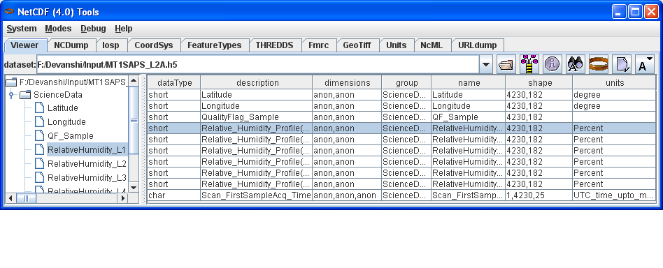 Hello, Here I have tried netcdfFile class to read .h5 file. But in both the way nullPointerException is coming when I try to read dataset of my .hs file. *I have attached a png file, containing screenshot of my file.* And the coding is, (1) package myapp; import java.io.IOException; import ucar.ma2.Array; import ucar.nc2.Dimension; import ucar.nc2.NetcdfFile; import ucar.nc2.Variable; public class Netcdf_readh5 { String filePath; int scans=0; public Netcdf_readh5() throws IOException { filePath="F:\\Devanshi\\Input\\MT1SAPS_L2A.h5"; NetcdfFile ncFile = NetcdfFile.open(filePath); // System.out.println(ncFile); Variable var1 = ncFile.findVariable("ScienceData"); //the dataset Variable var2 = ncFile.findVariable("Latitude"); Dimension d=var1.getDimension(0); System.out.println(d.getFullName()); // scans = var.getDimension(0).getLength(); //Getting scans // System.out.println("SCANS: "+scans); // int pixels = var.getDimension(1).getLength(); //Getting pixels // System.out.println("PIXELS: "+pixels); // float samples[] =var.read(double.class); //suppose dataset is float data // Array a=var.read(); // // float f[]; // // Object i=a.copyTo1DJavaArray(); // while(a.hasNext()) // { // System.out.println("getIndex"+a.getIndex()); // // } } public static void main(String args[]) throws IOException { new Netcdf_readh5(); } } /* Exception in thread "main" java.lang.NullPointerException at myapp.Netcdf_readh5.<init>(Netcdf_readh5.java:35) //The Line is: Dimension d=var1.getDimension(0); */ ===================================================== (2) package myapp; import java.io.IOException; import java.util.ArrayList; import java.util.Iterator; import java.util.List; import ucar.ma2.Array; import ucar.nc2.NetcdfFile; import ucar.nc2.Variable; public class netcdf3 { String filePath; public netcdf3() { filePath="F:\\Devanshi\\Input\\MT1SAPS_L2A.h5"; NetcdfFile ncFile=null; try { ncFile=NetcdfFile.open(filePath); // System.out.println("ncFile"+ncFile); List ranges = new ArrayList(); ranges=ncFile.getVariables(); Iterator i= ranges.iterator(); while(i.hasNext()) { System.out.println("\n iterator......"+i.next()); } String str_var_lat = "Latitude"; Variable v = ncFile.findVariable(str_var_lat); System.out.println(str_var_lat+" variable is "+v); Array a1=v.read(); System.out.println("\n\n\n ARRAY a1 : .................................................................."+a1); } catch(IOException ioe) { System.out.println("error"); } } public static void main(String s[]) { new netcdf3(); } } /* Exception in thread "main" java.lang.NullPointerException at myapp.netcdf3.<init>(netcdf3.java) // Array a1=v.read(); */ -- Devanshi U. Prajapati